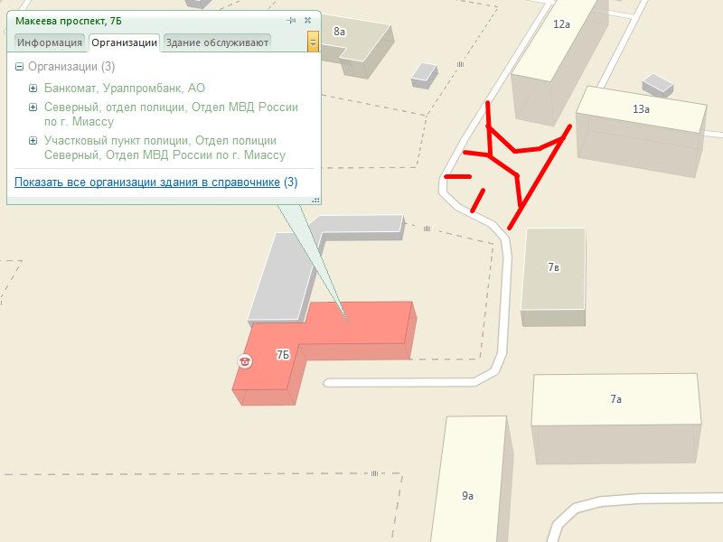 Полицейские северного отдела полиции сами укатали все газоны и тротуар, вместе с автолюбителями, привозящими своих детей в школу искусств. Красными отрезками на снимке указаны - направление движения автотранспорта, а также места парковки вне асфальта. На данной площадке из-за машин образовалась колея и в пасмурную погоду местность напоминает глубокую пашню с грязью и водой.