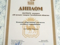 Разработка ОАО "ГРЦ Макеева" "Комплект оборудования для систем лечебного газоснабжения" стала лауреатом регионального конкурса "20 лучших товаров Челябинской области" в номинации "Товары производственно-технического назначения". Презентация медицинского оборудования состоялась 20 июня в Челябинске в рамках областной выставки товаров производственно-технического назначения.