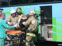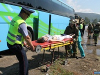 На прошедших сегодня тактико-специальных учениях отрабатывалось согласованность действий сил постоянной готовности (МВД, спасатели, пожарные, скорая медпомошь) и работа единой диспетчерской службы в случае крупного ДТП. По легенде учений произошло лобовое столкновение автобуса, перевозившего детей на Ильменскую турбазу, и грузового автомобиля "Урал".