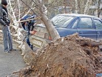 Сегодня, 9 мая, около пяти часов вечера сильным ветром во дворе дома № 61 по проспекту Макеева были с корнями выворочены сразу два дерева - берёза и липа. В результате падения повреждён припаркованный у подъезда автомобиль Лада 2110. Деревья росли практически сросшимися у корня.