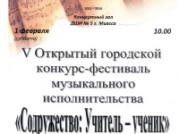 В первый день февраля в концертном зале ДШИ № 5 Миасса соберутся талантливые ученики и учителя из детских школ искусств Миасса, Златоуста, Сатки и Снежинска, чтобы в совместном творчестве показать свои исполнительские достижения на фортепиано, струнных смычковых, духовых и струнных народных инструментах. Самой маленькой участинице V открытого конкурса-фестиваля "Содружество: Учитель-Ученик" всего семь лет, а скрипачке из Сатки исполнилось семнадцать. Репертуар ансамблей отличается широтой... [далее]