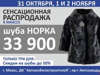 Только 31 октября, 1 и 2 ноября в Миассе пройдёт меховая ярмарка, которая обещает стать одним из самых масштабных событий осени. Скидки на шубы и дублёнки коллекций 2015 года до 50%, гарантия качества изделий от производителя, и, впервые в Миассе, акция "TRADE-IN": сдай старую шубу, получи скидку на новую. Пропустить такое предложение нельзя.