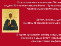 В субботу, 2 декабря, по благословению митрополита Челябинского и Миасского Никодима ко дню 130-летия основания Свято-Троицкого храма города Миасса прибудет ковчег с частицей мощей Святой Блаженной Старицы Матроны Московской. Встреча ковчега запланирована на 16:00.