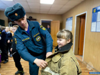 Ребята шумно зашли в помещение части, не забыв поздороваться со встречающими их сотрудников. "Здравия желаю!", - обратился к сотрудникам один из мальчиков, сопроводив слова воинским приветствием. Пожарные улыбаются и приглашают школьников пройти.