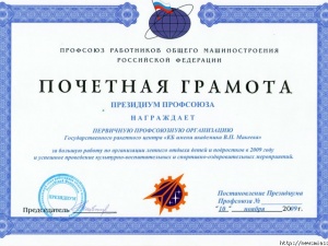 На основании постановления президиума профсоюза работников общего машиностроения РФ № 1755/12 от 10.11.2009 г. за большую работу по организации летнего отдыха детей и подростков в 2009 году и успешное проведение культурно-воспитательных и спортивно-оздоровительных мероприятий первичная профсоюзная организация работников ГРЦ "КБ им. академика В.П. Макеева" награждена Почетной грамотой ЦК Профсоюза и денежной премией. За большую работу по организации летнего отдыха детей и подростков в 2009 году Почетной грамотой ЦК Профсоюза также награжден коллектив детского оздоровительного лагеря "Космос" ОАО "ГРЦ Макеева". Администрация и профсоюзный комитет ГРЦ в период летней оздоровительной кампании-2009 обеспечили 100 процентное удовлетворение детскими путевками, выделив на оздоровление детей в целом более 4 млн. рублей. Пресс-служба ОАО "ГРЦ Макеева".