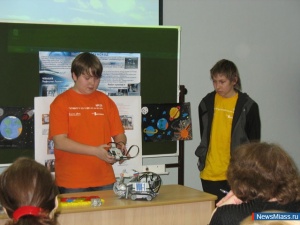 Вчера, 20 апреля, в Межшкольном методическом центре прошел конкурс ЛЕГО-роботов, посвященный 50-летию полета первого человека в космос. Конкурс проходил в двух номинациях: "Программируемые модели" и "Непрограммируемые модели". Это были и космические станции, луноходы, космолеты, маяки, вездеходы и даже космический парус для свадебного путешествия. Всего в конкурсе приняло участие 8 школ. Дети со 2 по 9 класс не только создали свои модели, но и умело представили их, защитив творческие проекты, подготовив буклеты с техническими характеристиками моделей, описанием этапов работы, компьютерной программой. В номинации "Непрограммируемые модели" I место было присуждено Ефимовой Софье (СОШ № 13) за исследовательский аппарат "Марсик". II место разделили Пестров Даниил (гимназия 26), построивший космолет, и Погонялкин Влад, Евсеев Саша из школы № 29 за модель лунного маяка. III место досталось юным космическим строителям аппарата "Глаз": Гурбанову Джамалу и Патлосову Алексею из школы № 13 и космическим спасателям - Артюх Владиславу и Воронцову Владимиру из гимназии 26. В номинации "Программируемые модели" победителем в младшей возрастной категории стал самый юный участник конкурса, второклассник Токарь Марк (школа № 21) с моделью "Лунохода", который снимал на видеокамеру грунт, сканировал и объезжал препятствия и двигался в заданном программой направлении. В старшей возрастной группе победа досталась Денисенко Павлу и Жильцову Кириллу, выступавшим за ДДТ "Остров" и школу № 7, создавшим модель вездехода ВУК-1. II место поделили команда школы № 1, придумавшая космическую станцию "Амега-3". По замыслу конструкторов станцию охраняли космические роботы, которые появлялись в тот момент, когда над станцией нависала опасность. Также диплом II степени получили Лычагин Никита из школы № 4 с моделью Лунохода. III место было присуждено Томусяк Михаилу и Дмитриеву Диме из школы № 13 за космический вездеход " Ferrari". Жюри были приятно удивлены технической сложностью созданных моделей. Очень надеемся, что клуб любителей ЛЕГО-роботов в Миассе расширится. Успехов вам, юные конструкторы! А через неделю в ММЦ пройдет финал творческого конкурса, где по этой же тематике будут представлены анимационные ролики, школьные газеты, фото-коллажи, эмблемы и слайд- фильмы, созданные учащимися школ города. Заместитель руководителя ММЦ Ольга Угрюмова