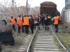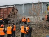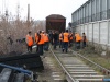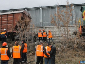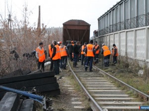 Сегодня утром, 19 октября, при движении небольшого состава из шести вагонов один из них сошёл с рельсов. Инцидент произошёл прямо напротив проходной школы ДОСААФ на подъездой ветке, ведущей к автомобильному заводу. Вагоны-хопперы, входящие в состав, по-видимому были пустыми и предназначались для перевозки цемента. С путей "соскочили" обе колёсные тележки вагона, но он остался на путях. Сход произошёл скорее всего из-за прогнивших деревянных шпал на этом отрезке железнодорожных путей. На место происшествия оперативно прибыли ремонтные бригады путейцев, к 12:40 вагон был поставлен на рельсы и состав продолжил следование. На участке путей, где произошёл сход, будут заменены шпалы, а, при необходимости и рельсы. Как сообщили в управлении ГОЧС, опасности ни для населения, ни для инженерных конструкций не возникло. Игорь Кривоносов