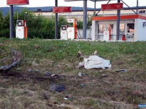 Судя по картине на месте происшествия, автомобиль, вылетев на обочину, срезал чугунные ограждения на одном конце заправки, ударился о бордюр, снёс "кирпич" на выезде с АЗС и, пролетев несколько десятков метров через газон, рухнул на въезде на заправку. В "полёте" автомобиль потерял капот, бампер, аккумулятор и другие части. Водитель вылетел через лобовое стекло и погиб на месте. Предположительно погибший - сотрудник такси, 1966 года рождения. Машина получила такие повреждения, что с первого взгляда трудно определить марку автомобиля - восстановлению транспортное средство не подлежит.