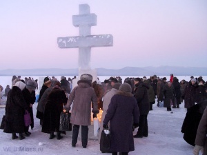 Сотни православных миасцев пришли в храмы сегодня, в день христианского праздника Богоявления. Утром в поселке Тургояк деятки прихожан собрались на крестный ход, который прошел от храма Архангела Михаила до озера Тургояк, где настоятель храма отец Виталий совершил обряд освящения воды. По традиции обряд завершился купанием в крестообразных прорубях. Желающие окунуться в освященные воды озера, а среди них были и стар и млад, выстраивались в очередь. Многие из них погружались в воду трижды, как и положено. Все остальные набирали воду в емкости, делая это с запасом, чтобы поделиться со своими близкими и друзьями. В праздник Крещения обряд на озере Тургояк проводится не так уж давно, примерно пятый год, но с каждым разом он собирает все больше верующих. Теперь в нем участвуют еще и хорошо узнаваемые в городе лица.