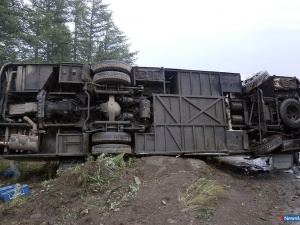 Вчера, 25 июня, около пяти часов вечера на 1766 км автодороги Москва-Челябинск водитель междугороднего автобуса "HIGER" маршрута Челябинск-Бакал на скользкой дороге (шёл дождь) не справился с управлением, в результате автобус съехал в кювет и опрокинулся на левый бок. В момент аварии в нём находилось 34 пассажира и водитель. Все 34 пассажира автобуса покинули аварийное транспортное средство самостоятельно, через люк в крыше автобуса и разбитые окна. В результате аварии различные травмы получили 13 человек, из них двое детей. Сотрудниками "скорой помощи" с места ДТП были эвакуированы 24-летняя девушка и 31-летний мужчина. В настоящее время девушка находится в больнице № 2 города Миасса, у неё диагностирован перелом позвоночника. Мужчина в результате ДТП получил закрытый перелом правого плеча, от госпитализации он отказался. Всех пассажиров отправили попутными рейсовыми автобусами до Челябинска. Всего для ликвидации аварии привлекалось 13 единиц техники и 41 человек служб быстрого реагирования.