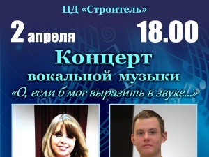 В ближайшую субботу, 2 апреля, на сцене Центра досуга "Строитель" состоится концерт вокальной музыки "О, если б мог выразить в звуке…". В нём примут участие молодые талантливые вокалисты: Дарья Сесина - студентка пятого курса Челябинского государственного института культуры и Сквирский Илья - студент первого курса миасского государственного колледжа искусства и культуры, ученики Ирины Владимировны Бедностиной. Молодые певцы являются лауреатами всесоюзных и международных конкурсов академического пения, стипендиатами министерства культуры Челябинской области, участниками всероссийских проектов "Новые имена. Новое поколение" и "Денис Мацуев представляет…".