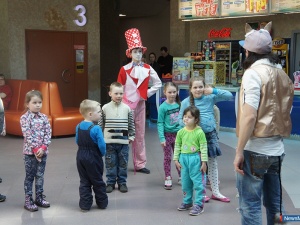 В последний день апреля кинозал "Гавайи" ТРК "Слон" порадовал детей новым мультфильмом "Волки и овцы" и весёлой развлекательной программой. Такие предпремьерные игровые программы давно стали одной из фирменных "фишек" кинозала, и очень полюбились миасской ребятне. Яркие ведущие - представший в образе Волка Владимир Скоков и грустный Мем в полосках на брюках и горошинах на цилиндре - ловко отлавливали сачком зазевавшуюся ребятню. А зачем отлавливал? Чтобы вытащить в большой конкурсный круг повторять за волком оригинальные движения, получать за это в подарок билеты на премьеру и садить морковку! Вы что, на самом деле думаете, что волки этого не делают? Да вас просто не было в субботу в "Гавайях"! Кто-то отличался и вниманием, и хорошей координацией, и за это снова был поощрён подарками. Долгожданная посадка морковки двумя командами - надо не только быстро продеть морковку в дырочки ковра-грядки, но и собрать урожай быстрее своих соперников. А зрителям дано своё задание - громко хлопать, топать и поддерживать. Пришлось ещё убегать от волка, а после того, как тебя поймали, помогать ловить других овечек, изображать зверей, которые живут в лесу, причём так правдоподобно, чтобы их можно было угадать. Надо было и сплести огромную паутину и самим в ней не запутаться. Фантазия ведущих неистощима, их конкурсы и забавы никогда не повторяются! Подарки тоже всегда интересные - билеты на премьеру, игрушки, карточки на приличные суммы в зал игровых автоматов. Юлия Кушпиль