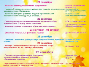 Вероятно трудно найти миасца, который не слышал бы, что в этом году наш город отмечает 245-летний юбилей. К торжественной дате различные учреждения города подготовили насыщенную развлекательную программу. Праздничные мероприятия начнутся уже на этой неделе. Горожан ждут интересные выставки, спектакли, концерты и многое другое. Тем же, кто не сможет побывать на мероприятиях сам, агентство новостей и информации NewsMiass.ru расскажет о самых ярких событиях и покажет наиболее красочные моменты. Какие же мероприятия ждут миасцев в ближайшее время? 14 сентября: Новый художественный театр. Спектакль "Сыроежка" (ЦД "Строитель") 15 сентября: Праздничное мероприятие, посвящённое 245-летию города (площадь перед администрацией) 12:00 - Парад первоклассников. Шествие по проспекту Автозаводцев от перекрестка улицы Лихачёва, построение первоклассников у ТРК "Слон". Концертно-развлекательная программа. (площадь перед администрацией) 13:00 - Краеведческий диктант (геологоразведочный колледж) 15:00 - "Добрый город Миасс". Концертная программа фольклорных коллективов, ярмарка мастеров декоративно-прикладного искусства. Работа площадки Благотворительного фонда "Сёма" (бульвар Мира) 18:00 - "Миасс - город, в котором хочется жить". Большая концертная программа с участием творческих коллективов Миасса и Златоуста и центра праздничный технологий "Аэробус". Выступление кавер-группы "Апрель" (Челябинск), трио "Баян-позитив" (Магнитогорск), вело-шоу "Гравити" (Екатеринбург), фаер-шоу "Адавита" (Челябинск). 21:30 - Праздничный салют 16 сентября 12:00 - Городской уличный праздник "Музыка без границ. Приношение родному городу". Концерт творческих коллективов и учащихся Детских школ искусств "Миасс на все времена" (площадь перед администрацией) Выставка специализированной техники городских предприятий (площадь перед администрацией) "Миасс-пазл" - программа Централизованной библиотечной системы (площадь перед администрацией) 18 сентября 18:00 - "С каждым поделись радостью своей...". Открытие творческого сезона. Театрализованная концертная программа (открытая сцена ДК "Бригантина") 21 сентября 13:00 - Выставка садоводов-любителей "Дары осени" (площадь ЦД "Строитель") Народный праздник осеннего урожая для людей с ограниченными возможностями "Оспожники" (выставочный зал ДНТ) Выставка овощей с участием людей с ограниченными возможностями "Во саду ли, в огороде" (выставочный зал ДНТ) 22 сентября: 13:00 - Литературно-музыкальная композиция, посвящённая Дню рождения села "Сердцу милая сторонка" (СДК села Сыростан) 17:00 - Массовое гуляние ко дню села "Село моё, село родное" (центральная площадь села Новоандреевка) 23 сентября: 15:00 - Детектив-квест "Кто украл улыбку". Закрытие летней программы чтения (Центральная детская библиотека) Областной театральный фестиваль "Сцена" (ДК "Прометей", ДК "Динамо"; по 3 октября) 25 сентября: 18:00 - Концерт Симфонического оркестра и солистов Театра оперы и балета имени М.Глинки (г. Челябинск) (ДК "Динамо") Выездной круглый стол "Библиотека в системе творческого, эстетического, духовно-нравственного, патриотического воспитания детей и молодёжи (совместно с ЧГИК; ЦГБ имени Ю.Н. Либединского) 28 сентября: 14:00 - Праздничная развлекательная программа, посвящённая Дню пожилого человека "Деревенская кадриль" (Городской дом культуры) 19:00 - Кукольные парадоксы в 2-х действиях "Аналогия" Челябинского 