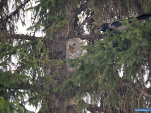 Сегодня, 18 февраля, выходящие из администрации после аппаратного совещания чиновники и журналисты стали свидетелями настоящей схватки между шумным союзом ворон и галок и невесть откуда взявшейся длиннохвостой неясытью. Расположившись на одной из елей, сова подверглась массовой атаке крупных чёрных птиц. Физического вреда дикой гостье городские обитатели не наносили - лишь остервенело кружили вокруг, норовя подобраться поближе, да без умолку и истошно каркали, очевидно, защищая находящееся поблизости гнездо. Тем не менее, когда неясыть попыталась скрыться от непривычного шума и перепорхнула через здание мэрии, - вороны устремились за ней. Через полчаса вся компания, в том числе и сова, вернулась обратно. Постепенно "местные" потеряли к "чужачке" интерес. Примечательно, что длиннохвостая - одна из самых крупных неясытей и может достигать одного метра в длину вместе с хвостом. Обитает преимущественно в высокоствольных смешанных лесах со значительной примесью хвойных пород. Основным кормом служат грызуны, в частности полёвки. Иногда ловит землероек, лягушек, насекомых, а также слётков воробьиных птиц. Неясыть в состоянии осилить белку, рябчика и тетерева. В пасмурные дни - такие, как сегодняшний, - активна не только ночью.