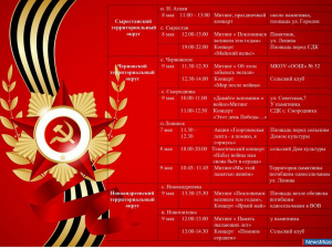 Всего через два дня во всей России и за её пределами будет отмечаться большой праздник - День Победы. 74 года прошло с того памятного дня, но подвиг солдат, спасших будущее поколений, не забыт. Из года в год это подтверждается широким празднованием 9 Мая. Не остаётся в стороне и Миасс: здесь, как и везде, запланированная обширная программа мероприятий. Некоторые из них уже начались, основное же празднование пройдёт, конечно, в четверг, 9 мая - в сам праздник. Итак, что же ждёт горожан в ближайшие дни? 7 мая: 12:00 - Акция "Минута памяти" в учреждениях культуры, образования, спорта, на предприятиях, в организациях. 11:45 - 14:00 - Городской конкурс песни и строя (Центральная площадь) 11:30 - 12:30 - Акция "Георгиевская лента - Я помню, я горжусь" (посёлок Ленинск, площадь перед СДК) 8 мая в районах города: 11:00 - 13:00 - Торжественный приём ветеранов, концертная программа (КЦСОН, вход по пригласительным) 11:00 - 12:00 - Митинг "Этих дней не смолкнет слава" (территория завода ОАО "Миассэлектроаппарат") 12:00 - Митинг у памятника (ст. Миасс-2) 18:00 - 19:30 - Концерт "Салют Победы" (ДК "Динамо") 18:00 - 19:30 - Концерт "Салют Победы" (ДКиТ "Прометей", вход по пригласительным) 18:00 - 19:30 - Праздничная концертная программа (открытая площадка перед ДК "Бригантина") 18:00 - 20:00 - Концертная программа "Победная весна" (площадь перед ЦД "Строитель") 18:00 - 20:00 - Праздничная программа (ГДК) 8 мая на сельских территориях: 11:00 - 13:00 - Митинг, праздничный концерт (пос. Нижний Атлян, около памятника, площадь ул. Городок) 12:00 - 13:00 - Митинг "Поклонимся великим те годам" (село Сыростан, памятник, ул. Ленина) 19:00 - 22:00 - Концерт "Майский вальс" (село Сыростан, площадь перед СДК) 18:00 - 20:00 - Тематический концерт "Набайт войны нам снова бьёт в сердца" (посёлок Ленинск, СДК) 9 мая в центре Миасса: 8:30 - Формирование праздничной колонны предприятий, организаций и жителей города (Предзаводская площадь - ДК автомобилестроителей) 9:15 - 10:00 - Праздничное шествие по проспекту Автозаводцев к центральной площади 10:00 - Митинг 11:00 - Тематический видео-концерт "Лента времени" 13:00 - 82-легкоатлетическая эстафета на призы администрации Миасского городского округа и газеты "Миасский рабочий" (по проспекту Автозаводцев) 14:30 - Формирование колонны "Бессмертного полка" на проспекте Автозаводцев у ДК автомобилестроителей 15:00 - 16:00 - Общегородская единая акция "Бессмертный полк", шествие по проспекту Автозаводцев к мемориалу "Скорбящая мать" 16:15 - 16:30 - Показательные выступления воспитанников военно-патриотических клубов Миасского городского округа 16:30 - 19:00 Городская поэтическая эстафета "И слово память оживит" 19:00 - 19:30 Флешмоб общественного движения "Волонтёры Победы" - "Вальс Победы" 19:30 - 22:30 Большой праздничный концерт лучших творческих коллективов Миасского городского округа "Победа, мы после тебя родились" 22:30 - 23:00 Праздничный салют. 9 мая в других районах города: 12:00 - 13:30 Митинг (мемориал "Народу-победителю - народу созидателю") 11:00 - 12:15 Митинг, концертная программа (посёлок Тургояк, ул. Ленина - ул. Коминтерна) 12:00 - 13:00 Митинг на площади МНЗ у памятника советскому солдату. 9 мая в сельских территориях: 11:30 - 12:30 - Митинг "Об этом забывать нельзя" (село Черновское, школа № 32) 10:00 - 11:00 - Митинг "Давайте вспомним о войне" (село Смородинка, ул. Советская, 7 - у памятника) 11:00 - 12:30 - Концерт "Этот день Победы" (село Смородинка, СДК) 10:45 - 11:45 - Митинг "Мы этой памятью живём" (посёлок Ленинск, территория па