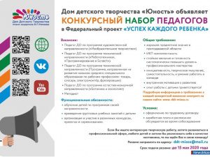 МАУ ДО "ДДТ "Юность" имени В.П. Макеева" проводит конкурсный набор педагогов в Федеральный проект "Успех каждого ребёнка". Проект, который будет реализован с сентября 2020 года на базе "Юности", направлен на обучение 500 детей 7-18 лет по программам художественной, технической и естественнонаучной направленности. У каждого направления есть свои требования к образованию кандидатов: - арт-студия - наличие высшего или среднего профессионального образования по следующим специальностям: искусство, архитектура, черчение, дизайн, художественная графика, моушн-дизайн; - хайтек-лаборатория - наличие высшего или среднего профессионального образования (технического) по работе с высокотехнологичным оборудованием (станки с ЧПУ); - робо-лаборатория - наличие высшего или среднего профессионального образования (технического): робототехника и программирование; - био-лаборатория - наличие высшего или среднего профессионального образования в области биологии и химии. Общие требования:
