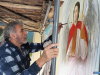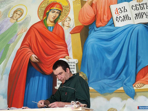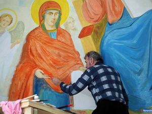 Сейчас идут росписи алтаря, стен и столбов храма. Расписывает храм замечательный живописец Александр Евсеев со своим племянником Алексеем Горшковым. Об Александре можно много рассказывать. На церковном сайте есть отдельная статья о нём.