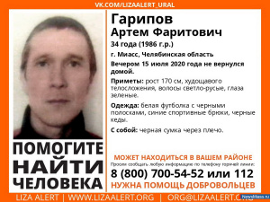 Региональный поисковый отряд "Лиза Алерт" в официальном сообществе в социальной сети "ВКонтакте" опубликовал пост о розыске 34-летнего Артёма Фаритовича Гарипова - жителя Миасса.