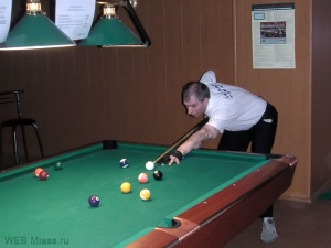 В воскресенье 9 апреля состоялось открытое первенство Миасса по американскому бильярду, игра - " Восьмерка ". В турнире приняло участие 14 спортсменов, которые по кубковой (до двух поражений) системе разыграли звание чемпиона. Это был уже 25-й по счету городской турнир по пулу, проводимый федерацией бильярда начиная с 2001 года. За это время сложился постоянный состав игроков, участвующих в турнирах, выросло их мастерство и большая часть участников могла претендовать на попадание в тройку призеров. Результаты матчей в "верхней" сетке начиная с 1\4 финала: Чистяков Лев - Фролов Денис - 3-1, Капров Алексей - Кодеков Алексей - 3-1, Семенов Евгений - Береснев Дмитрий - 3-1, Васильев Александр - Афлетунов Анвар - 3-0, Чистяков Лев - Капров Алексей - 3-1, Васильев Александр - Семенов Евгений - 3-2, Васильев Александр - Чистяков Лев - 4-0. Итак, по "верхней" сетке в финал турнира вышел Васильев Александр. В "нижней" сетке страсти еще более накалились - ведь тут поражение означало выбывание из турнира. Результаты матчей в "нижней" сетке начиная с 1\4 финала: Афлетунов Анвар - Рубцова Галина - 3-1, Фролов Денис - Кодеков Алексей - 3-1, Капров Алексей - Афлетунов Анвар - 3-2, Семенов Евгений - Фролов Денис - 3-2 Семенов Евгений - Капров Алексей - 4-1, Семенов Евгений - Чистяков Лев - 4-2. Вот как развивалась финальная партия: Семенов Евгений - Васильев Александр: 0-1, 1-1,2-1,3-1,3-2,4-2. Евгений заслуженно становится чемпионом - он меньше ошибался, умело использовал ошибки соперника, а две партии он закончил очень красивыми дуплетами. Итак результаты турнира: I место - Семенов Евгений, II - место - Васильев Александр, III - место - Чистяков Лев. Грамотами за красивую игру награждены - Капров Алексей и Афлетунов Анвар - они радовали зрителей сложными в техническом исполнении ударами. Семенов Евгений получил грамоту за "самую быструю" партию. В ближайших планах федерации - турнир по русскому бильярду, который начнется 22 апреля, как сообщает федерация бильярдного спорта.