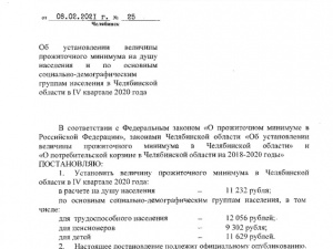 Губернатор Челябинской области Алексей Текслер подписал постановление об установлении величины прожиточного минимума на душу населения в Челябинской области в четвёртом квартале 2020 года. Документ фиксирует снижение прожиточного минимума. В соответствии с постановлением, опубликованным на портале правовой информации, в четвёртом квартале 2020 года прожиточный минимум на душу населения устанавливается на уровне 11232 рублей. Это на 198 рублей меньше, чем было в третьем квартале 2020 года. Сокращение касается всех социально-демографических категорий населения. Для работающих граждан прожиточный минимум составит 12056 рублей (на 191 рубль ниже уровня третьего квартала 2020 года), для пенсионеров - 9302 рубля (на 115 рублей ниже), для детей - 11629 рублей (на 336 рублей ниже). Напомним, что с 2021 года прожиточный минимум устанавливается один раз в год, а не раз в квартал, как было ранее.