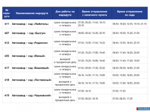 Администрация Миасского городского округа сообщила, каким будет расписание движения автобусов, курсирующих по муниципальным дополнительным садовым маршрутам. График движения садовых автобусов уже известен. В мэрии отмечают, что на данный момент идут конкурсные процедуры по организации перевозки пассажиров. 411 Автозавод - сад "Любитель" Дни работы на маршруте: кроме понедельника и четверга. Время отправления с конечного пункта: 07:30; 09:20; 11:45; 18:15; 20:10. Время отправления из сада: 08:30; 10:20; 12:35; 19:10; 21:10. 407 Автозавод - сад "Бызгун" Дни работы на маршруте: кроме понедельника и четверга. Время отправления с конечного пункта: 08:00; 09:40; 14:30; 20:10. Время отправления из сада: 08:50; 10:30; 15:20; 21:00. 412 Автозавод - сад "Родничок" Дни работы на маршруте: кроме понедельника и четверга. Время отправления с конечного пункта: 07:55; 13:00; 17:45; 19:25. Время отправления из сада: 08:45; 13:55; 18:35; 20:10. 435 Автозавод - сад "Южный" Дни работы на маршруте: кроме понедельника и четверга. Время отправления с конечного пункта: 07:20; 10:20; 17:00; 19:40. Время отправления из сада: 08:50; 11:40; 18:20; 20:50. Дни работы на маршруте: выходной и праздничный день. Время отправления с конечного пункта: 07:20; 10:20; 16:00; 18:40. Время отправления из сада: 08:50; 11:40; 17:20; 19:50. 417 Автозавод - сад "Вишневый" Дни работы на маршруте: кроме понедельника и четверга. Время отправления с конечного пункта: 07:55; 09:00; 17:30; 20:20. Время отправления из сада: 08:30; 09:30; 18:00; 21:00. 418 Автозавод - сад "Лиственный" Дни работы на маршруте: кроме понедельника и четверга. Время отправления с конечного пункта: 08:10; 14:00; 17:15; 19:00. Время отправления из сада: 09:00; 15:00; 18:05; 20:00. Дни работы на маршруте: выходной и праздничный день. Время отправления с конечного пункта: 08:10; 10:10; 17:15; 19:00. Время отправления из сада: 09:00; 11:00; 18:05; 20:00. 419 Автозавод - сад "Чашковский" Дни работы на маршруте: кроме понедельника и четверга. Время отправления с конечного пункта: 07:50; 18:10. Время отправления из сада: 07:00; 17:30. Дни работы на маршруте: выходной и праздничный день. Время отправления с конечного пункта: 07:50; 09:20; 18:10. Время отправления из сада: 07:00; 08:35; 17:30. 410 ул. Ур.Добровольцев - сад "Северный-2" Дни работы на маршруте: кроме понедельника и четверга. Время отправления с конечного пункта: 08:35; 12:20; 19:25. Время отправления из сада: 09:00; 12:45; 19:40. 415 ул. Ур.Добровольцев - сад "Брусничный" Дни работы на маршруте: кроме понедельника и четверга. Время отправления с конечного пункта: 07:20; 10:10; 13:05; 18:30; 19:45. Время отправления из сада: 07:50; 10:50; 13:45; 19:00; 20:15. 428 ул. Ур.Добровольцев - сад "Земляничный" Дни работы на маршруте: кроме вторника и четверга. Время отправления с конечного пункта: 08:10; 11:40; 15:45; 18:50. Время отправления из сада: 08:30; 12:10; 16:25; 19:30. 415и Стадион - сад "Ильмены", сад "Ильмены Южные" Дни работы на маршруте: кроме понедельника и четверга. Время отправления с конечного пункта: 08:30; 09:05; 09:45; 13:20; 14:50; 17:25. Время отправления из сада "Ильмены": 07:05; 09:25; 12:55; 14:25; 19:00; 19:40. Время отправления из сада "Ильмены Южные": 07:00; 09:30; 12:50; 14:20; 18:55; 19:35. 416в Автозавод-сад "Энергетик" Дни работы на маршруте: кроме понедельника и четверга. Время отправления с конечного пункта: 09:00; 17:00; 17:30. Время отправления из сада: 14:45; 17:40. 416у ул. Ур.Добровольцев - сад "Энергетик" Дни работы на маршруте: кроме понедельника и четверга Время отправления с конечного пункта: 14:15 Время отправления из сада: 09:45; 18:20 10с Автозавод - СНТ "Золотая Долина" Дни работы на маршруте: ежедневно. Время отправления с конечного пунк