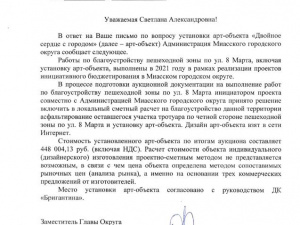 Порядка двух недель в Миассе не смолкают разговоры по поводу недавно появившегося возле Дома культуры "Бригантина" арт-объекта в виде сердца. Первыми эту тему подняли в городском сообществе "Свободный Миасс". Представители популярного паблика не просто хотели услышать мнение горожан по поводу появления двойного сердца, но и просили администрацию города прокомментировать стоимость нового арт-объекта, который обошёлся бюджету почти в полмиллиона рублей. И если пользователи соцсети активно делились своим мнением, то пояснений от властей не последовало. "Колеи бы лучше спилили на эти деньги. Двоих уже схоронили... До весны будет пять...", "Вчера увидел и не понял что это за фигня недоделаная, а оказывается это арт-объект!", "Я подумал сначала, может 4 тысячи с копейками...а нет...откуда такие цены то берутся?" - это наиболее мягкие в выражениях комментарии, которые появились под постом. Кроме того в постах появилась информация и о том, что арт-объект должен был появиться ещё в октябре прошлого года, а на самом деле возник лишь в последних числах декабря и то в незавершённом виде. А вот работы, по словам авторов постов, были приняты и оплачены мэрией. Эмоции эмоциями, а чтобы узнать официальную версию, мы направили официальный запрос в администрацию Миасса. В своём обращении мы попросили пояснить несколько вопросов: какова стоимость установленного арт-объекта, кто был инициатором его установки и кто является дизайнером/разработчиком сердца, почему было выбрано именно это место для его установки? Кроме того, попросили пояснить, откуда вообще появился арт-объект в виде двойного сердца, если в первоначальном варианте проекта благоустройства, за который проходило голосование, его не было. В адрес нашей редакции пришёл ответ, в котором сказано, что работы по благоустройству пешеходной зоны по улице 8 Марта, включая установку арт-объекта, выполнены в 2021 году в рамках реализации проектов инициативного бюджетирования в МГО. Дизайн арт-объекта был взят из сети Интернет. "Стоимость арт-объекта по итогам аукциона составила 448004,13 рубля (включая НДС). Расчет стоимости объекта индивидуального (дизайнерского) изготовления проектно-сметным методом не представляется возможным, в связи с чем цена объекта определялась методом сопоставимых рыночных цен (анализа рынка), а именно трёх коммерческих предложений", - говорится в ответе. Также уточняется, что место установки арт-объекта согласовано с руководством ДК "Бригантина". В то же время некоторые жители восприняли место установки как какое-то издевательство: в то время, когда сам Дом культуры нуждается в ремонте внутри, деньги тратятся на "наведение красоты" рядом. Соответствующий пост с подробным рассказом о выживании "Бригантины" также появился в "Свободном Миассе". Кроме того, создатели паблика написали обращения в Прокуратуру Челябинской области, Следственный комитет по Челябинской области, губернатору Алексею Текслеру и в администрацию Миасса. Чем закончится эта история, покажет время. Агентство новостей NewsMiass.ru будет следить за развитием событий.