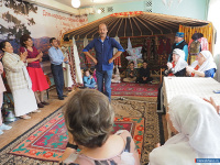 Вчера, 27 июня, в Доме народного творчества прошли мастер-классы от специалистов Республиканского центра народного творчества и Дома дружбы народов республики Башкортостан. Гости из Уфы познакомили всех желающих с азами народных видов искусства. Посетители смогли попробовать себя в игре на кубызе и курае, приобщиться к народной хореографии, разучив башкирские танцы, и насладиться лиричным исполнением народных песен на башкирском языке. Визит в Миасс нанесли признанные эксперты в своём деле. Организовать мастер-классы помог Башкирский историко-культурный центр Челябинской области - филиал Дома дружбы народов Республики Башкортостан. По просьбе неутомимого руководителя клуба "Ак инэйзэр" (Дом народного творчества г. Миасса) Булякай Шафиковой его сотрудники договорились о визите в Миасс лауреата республиканских конкурсов, преподавателя БРГИ № 1 имени Рами Гарипова, руководителя детского образцового ансамбля кураистов имени Адигама Искутина Василя Баймурзина, лауреата международных конкурсов, режиссёра-постановщика танцев Азамата Каримова, народного артиста республики Башкортостан, виртуоза-кубызиста, солиста-инструменталиста Миндигафура Зайнетдинова и солистки Башкирской государственной филармонии имени Хусаина Ахметова, народной артистки Республики Башкортостан Сайды Ильясовой. Мастера песни, танца и игры на музыкальных инструментах уже провели такие уроки для в Челябинске, Сосновском и Кунашакском районе, а теперь и в Миассе. Как заведено в клубе "Ак инэйзэр", гостей встретили хлебосольно: песнями, плясками и традиционным угощением. Подкрепить силы после долгой дороги их пригласили за стол. Обилие национальных блюд приятно удивило экспертов. Участницы клуба напекли башкирских пирогов и пирожков к чаю, спонсор Гузель Садретдинова подарила гуся, из которого бабушки наварили густого, ароматного супа с домашней лапшой. "Ух ты, так вкусно - прямо как раньше!" - оценили блюдо едоки. Пока специалисты переводили дух за обедом, состоялось торжественное награждение победителей областного конкурса "Сто лет в обед". Раиса Насырова стала лауреатом I степени в номинации "Мясо впрок", Райхана Даутова удостоилась второго места в номинации "Пироги". Конкурсантки получили грамоты и ценные призы: мясорубку и блендер. После краткой презентации, где артисты рассказали о своих видах искусств и исполнили короткие номера, гости и участники разошлись по площадкам. В течение дня желающие смогли попробовать себя в каждом направлении, уделив больше внимания наиболее приглянувшемуся. Особым спросом пользовались вокал и игра на курае. Некоторые ученики так впечатлили педагога, что получили музыкальные инструменты в подарок. Осваивать новый вид искусства теперь смогут участник детской группы клуба "Ак инэйзэр" Арслан Насыров и Фагиля-апа. Эта смелая женщина в свои почтенные 70-лет не побоялась впервые взять в руки инструмент и снова ощутить себя ученицей. Теперь она сможет заниматься музыкой вместе с единомышленниками, присоединившись к клубу "Ак инэйзэр". Разнообразить музыкальное сопровождение своих выступлений смогут и завсегдатаи клуба: им тоже подарили инструмент. Все - и ученики, и педагоги - остались довольны встречей. Гости были впечатлены душевной встречей и энтузиазмом миасцев, а участники мастер-классов познакомились с а