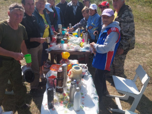 Погода стояла солнечная, облака ненадолго загораживали солнце, которое ещё по-летнему припекало. После восхождения ветераны искупались в чистейшем озере Аушкуль. А после игры в волейбол праздник продолжился за походными столами чаепитием и песнями под гитару.