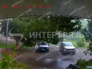 ЧП произошло во дворе дома на улице Богдана Хмельницкого. Как видно на записи, в непогоду женщина скрывается от дождя возле дерева, после чего уходит, а спустя считанные секунды из-за сильных порывов ветра тополь ломается и падает. При этом ветки задевают припаркованные во дворе автомобили. Позднее их владельцы зафиксировали вмятины и царапины.