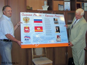Сегодня, 22 августа, в России отмечается День Государственного флага. По случаю этого события Миасское отделение партии "Единая Россия" провело акцию, вручив главе округа Ивану Бирюкову и главе администрации Виктору Ардабьевскому стенд с изображением государственной и областной символики - флагов, гербов и текста гимнов России и Челябинской области. Кроме того, на стенде помещены фотографии президента страны Владимира Путина, губернатора Петра Сумина и депутата Государственной думы от Миасса Валерия Панова. Ранее подобный стенд был вручен центральной городской библиотеке. А в начале учебного года такие подарки получат все школы города. Как пояснил член политсовета местного отделения "Единой России", помощник депутата Госдумы Николай Федоров, делается это для того, чтобы наши дети росли патриотами своей страны, чтобы их гражданское самосознание формировалось с раннего возраста. Елена Илюшина