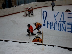 В ходе сегодняшних игр спортсмены постоянно ощущали поддержку со стороны членов молодежной организации "Молодая гвардия", которые не только болели за хоккеистов, заражая их оптимизмом, но и активно помогали в перерывах между играми чистить поле от снега.